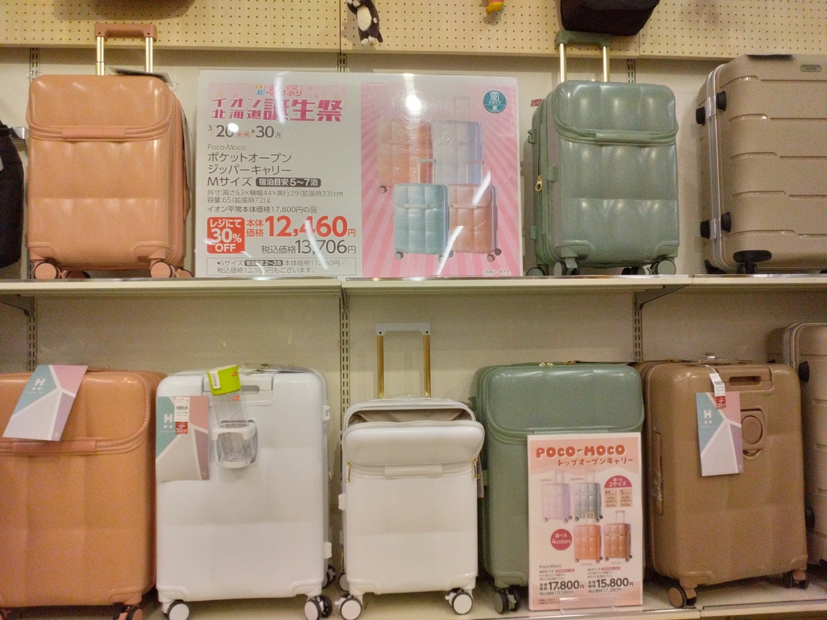 26.03.23 イオン北海道誕生祭おすすめキャリー イオン超春トク祭り開催中 ACEコラボキャリー ポケットオープンジッパーキャリー 本体価格より30%OFF 3月30日までの期間限定価格です ぜひお見逃しなく❣