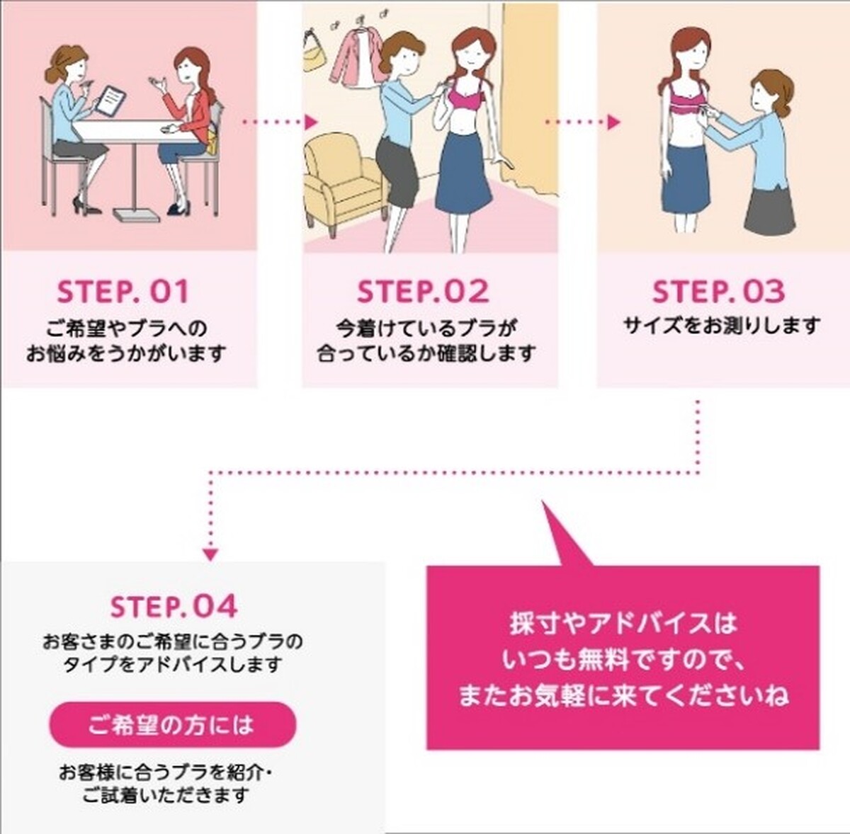 専門のカウンセラーが、ブラやバストについてお客様のお悩みをお聞きし、採寸&アドバイス。ご希望の方にはフィッティングも行います。