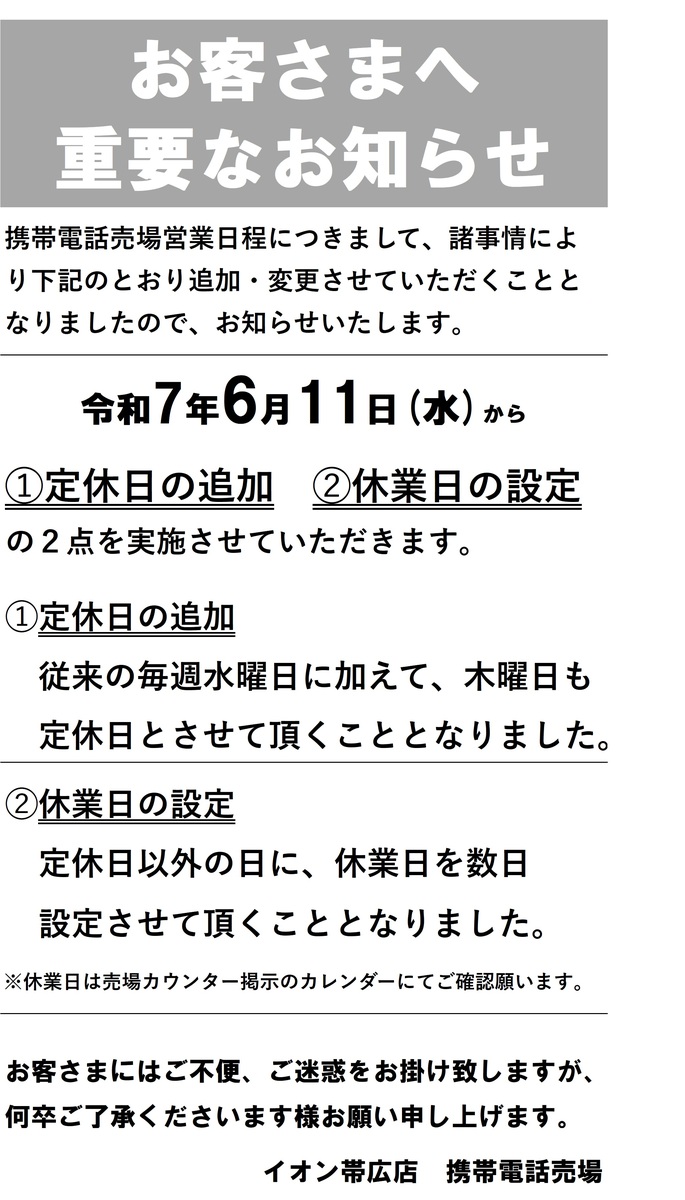 25.10.25 【11月】携帯電話売場定休日・休業日のご案内 携帯電話売場では定休日・休業日を設けております。 つきましては【11月】の定休日・休業日をカレンダーにて お知らせいたします。 カレンダーは売場カウンターに掲示・当アプリ店舗情報 にてお知らせしています。