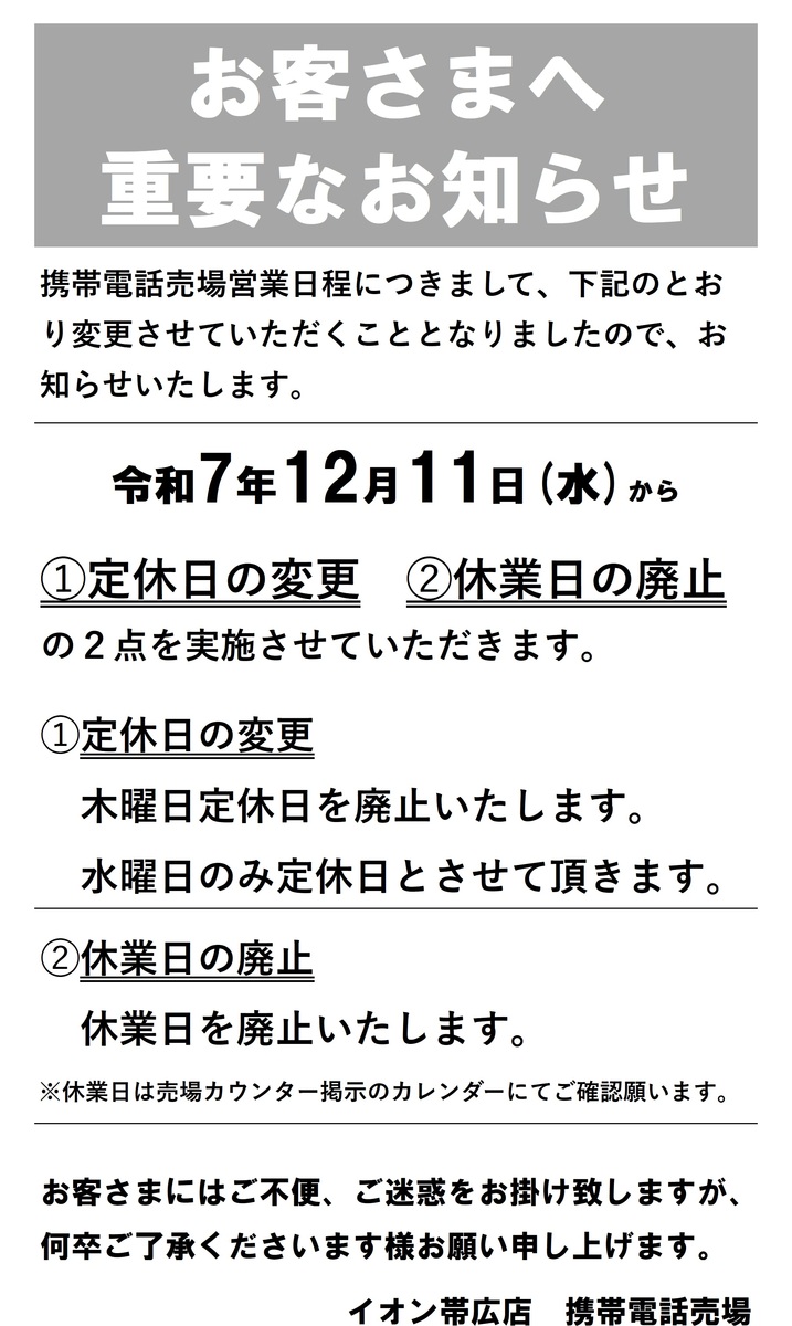 【12月】携帯電話売場定休日・休業日のご案内と変更のお知らせ