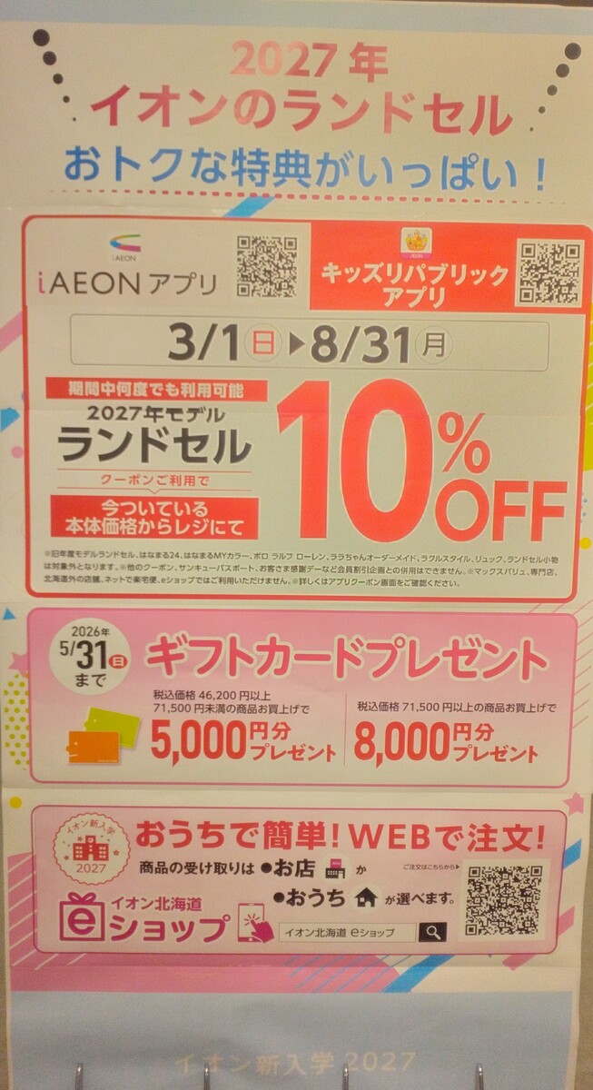 3月1日より2027年イオンのランドセル予約受付開催中でございます🎒