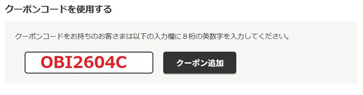 クーポンコードは『OBI2604C』※アルファベットは大文字です。