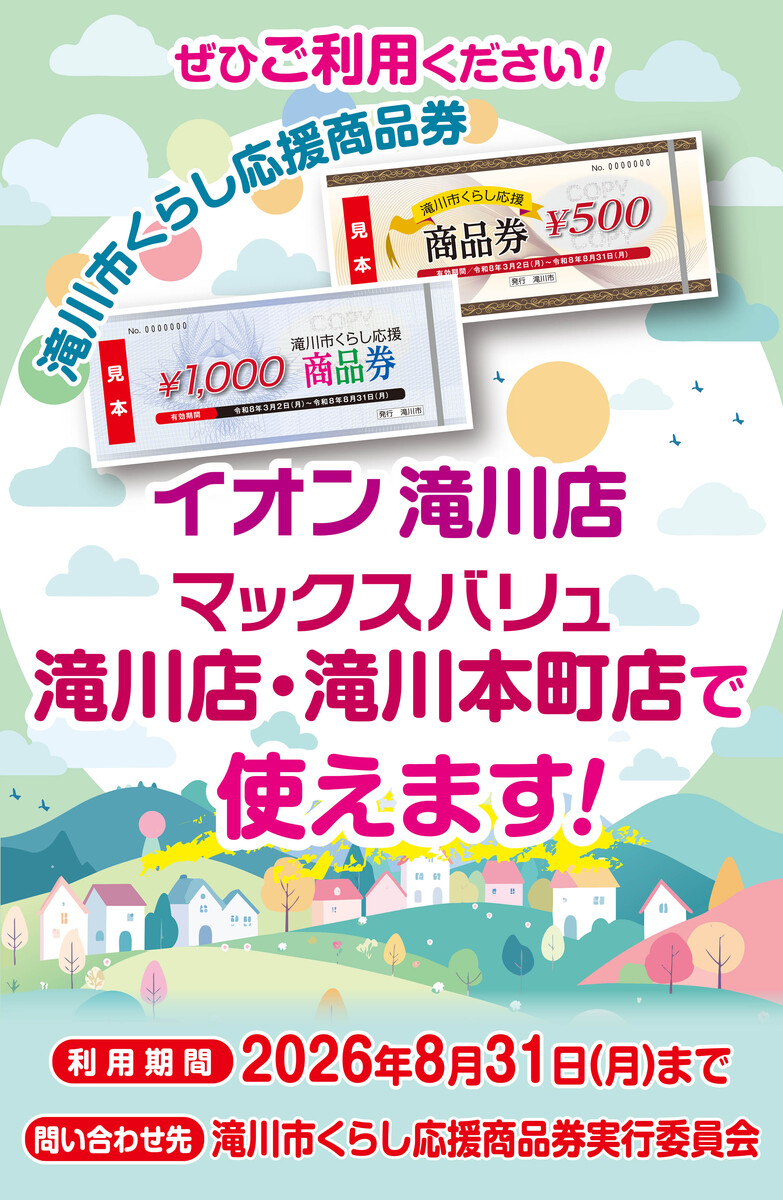 26.02.25 【3月2日から】当店で滝川くらし応援商品券がご利用いただけます 当店では滝川くらし応援商品券がご利用いただけます。 📆ご利用期間2026年3月2日(月)~2026年8月31日(月) 皆さまのご来店をお待ちしております。