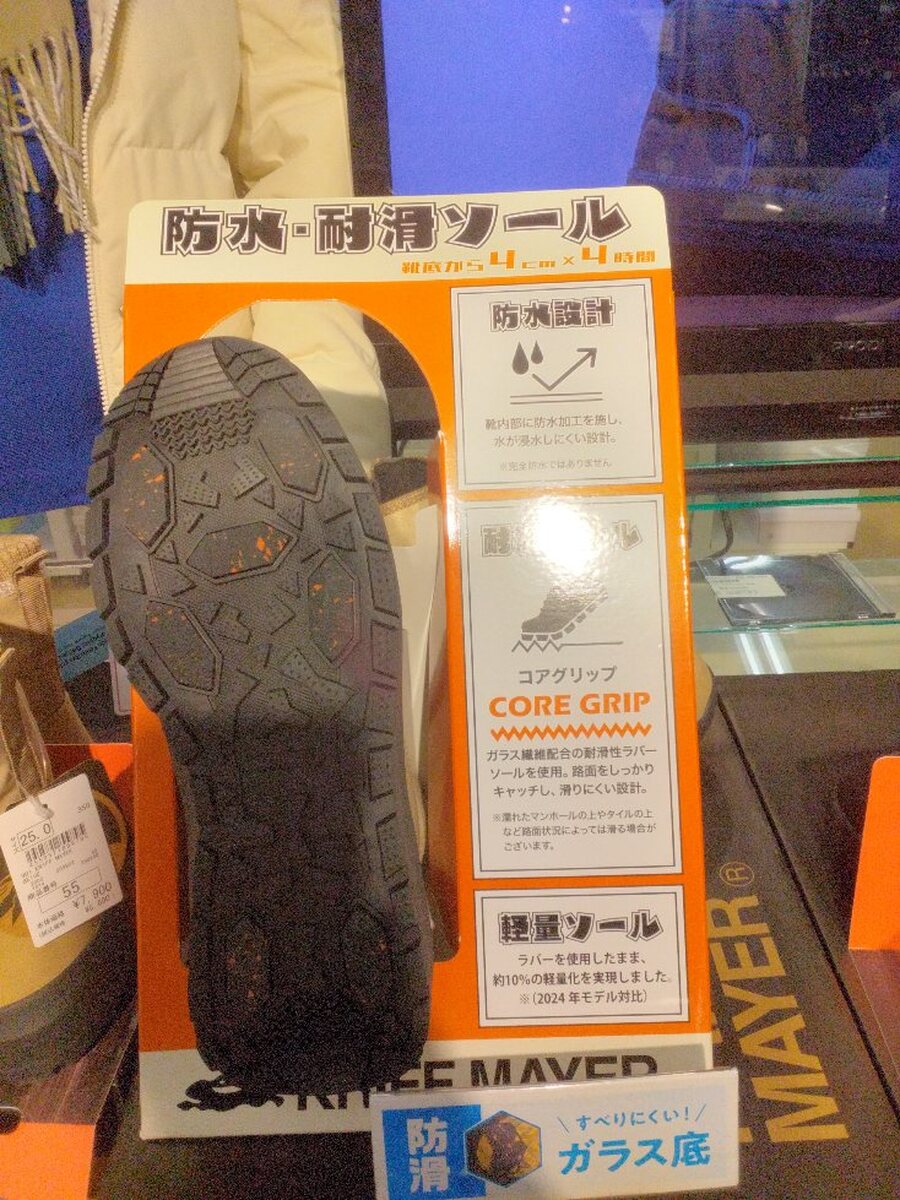 クリフメイヤーは滑りにくい”ガラス底(コアグリップ)”を使用しているので冬の凍った道も歩きやすいです!