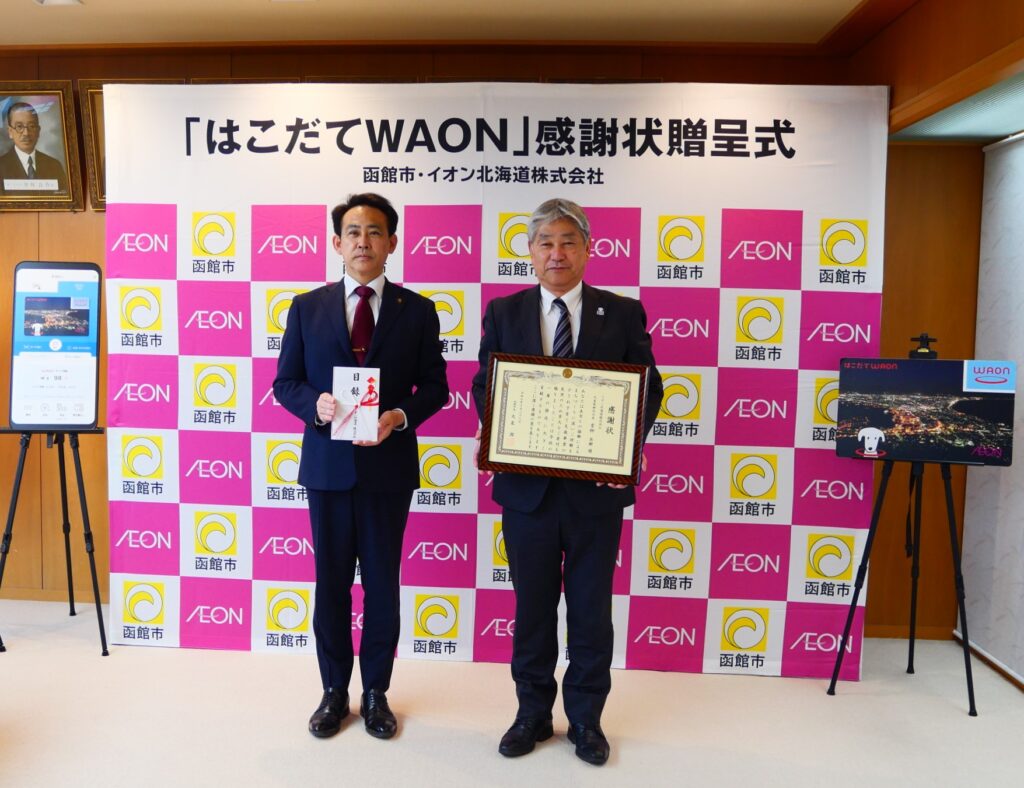 函館市とイオン株式会社は、双方が持つ資源を有効に活用し、市民が心豊かに暮らし、“夢や希望があふれるみらいのまちづくり”に協働で取り組むことを目的に、2014年10月に「協働のまちづくりに関する協定」を締結し、その取り組みの一環として電子マネー「はこだてWAON」を発行しました。このWAONは、イオングループの各店舗やWAON加盟店でご利用いただくことにより、そのご利用金額の一部を函館市に寄付し、子育て支援事業に役立てられています。