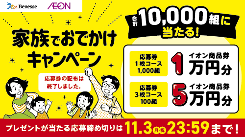 ベネッセ×イオンモール 対象専門店で抽選応募券をもらってwebで応募しよう! 家族でおでかけキャンペーン2025秋 合計10,000組に抽選でプレゼント!