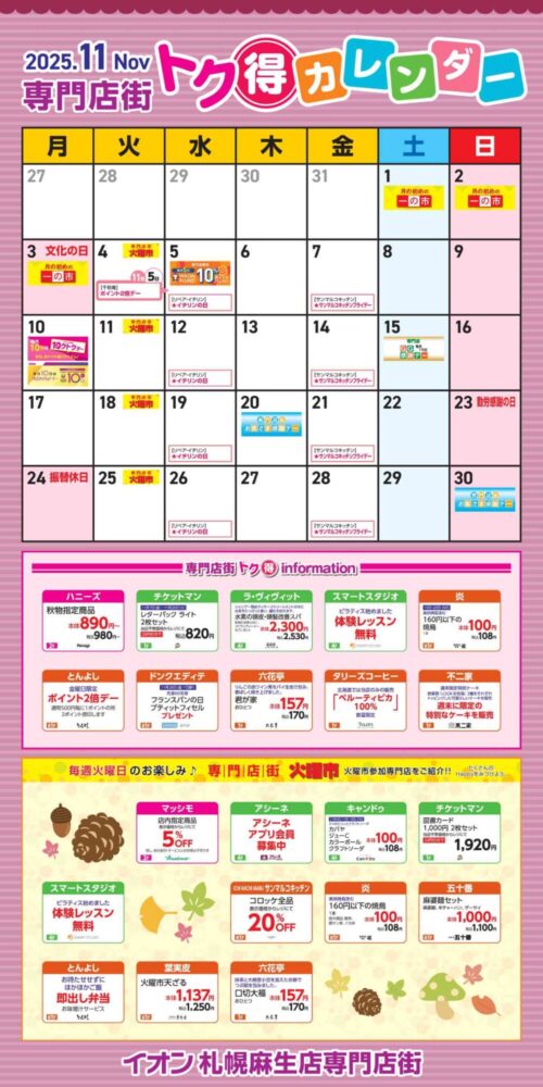 サービス 2025.11 専門店街 トク得カレンダー 【2025.11 専門店街 トク得カレンダー】 専門店街 トク得information 毎週火曜日のお楽しみ♪ 専門店街火曜市 火曜市参加専門店をご紹介!!