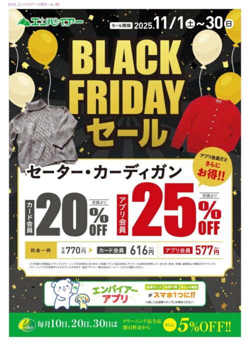 サービス BLACK FRIDAYセール セーター・カーディガン カード会員 定価より20%OFF アプリ会員 定価より25%OFF ※料金一例 カード会員 定価770円(税込)⇒616円(税込) アプリ会員 定価770円(税込)⇒577円(税込)