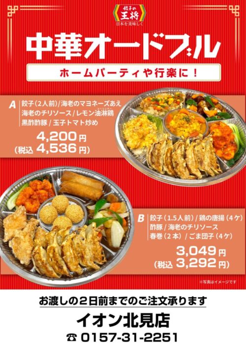 餃子(1.5人前)/鶏の唐揚(4ケ)/酢豚/海老のチリソース/春巻(2本)/ごま団子(4ケ)