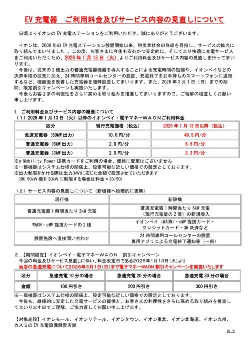 今後は、従来の2倍出力の普通充電器機器を導入することによる充電時間の短縮や、イオンペイなどの決済手段の拡充に加え、24 時間専用コールセンターの設置、充電終了をお手持ちのスマートフォンに通知するなど、機能面を改善した充電器を随時設置してまいります。また、2026年3月1日(日)までの期間、限定割引キャンペーンも実施いたします。