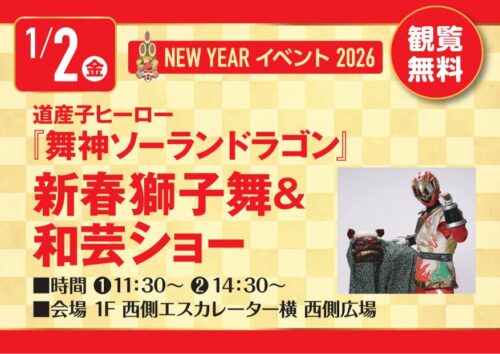 サービス イオン千歳店 NEW YEAR イベント2026 道産子ヒーロー 『舞神ソーランドラゴン』 新春獅子舞&和芸ショー ■時間/①11:30~ ②14:30~ ■会場/1F 西側エスカレーター横 西側広場 ■観覧無料
