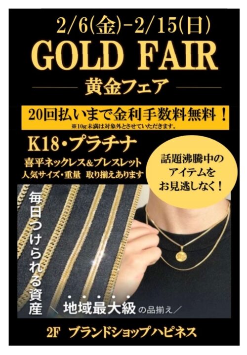 グッズ 黄金フェア開催!! ハピネス帯広店では金やプラチナの喜平や地金商品を取扱いしております。 2月6日~2月15日の間は今年最初の黄金フェアを開催! いま話題沸騰中のアイテムをどうぞお見逃しなく!!