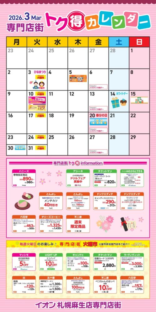 サービス 2026.3 専門店街 トク得カレンダー 【2026.3 専門店街 トク得カレンダー】 専門店街 トク得information 毎週火曜日のお楽しみ♪ 専門店街火曜市 火曜市参加専門店をご紹介!!