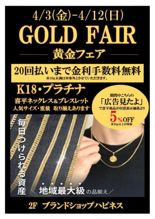 ハピネス帯広店では、金やプラチナの喜平や 他金商品を取扱いしております。 4/3~4/12の間は黄金フェアを開催! いま話題沸騰中のアイテムをどうぞお見逃しなく!!
