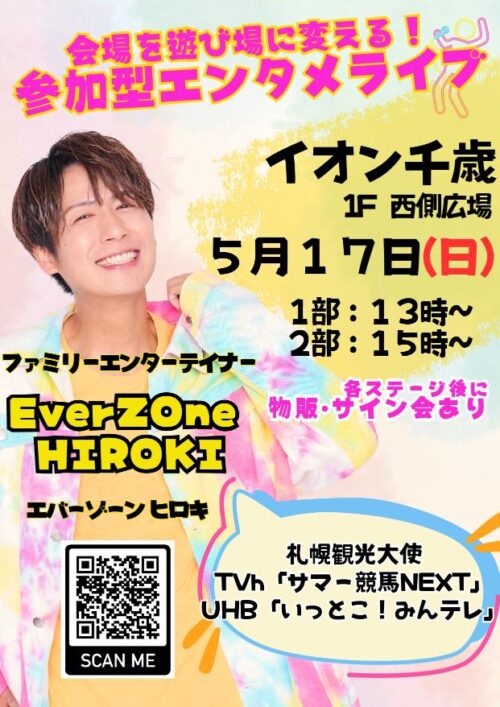 サービス インストアライブのお知らせ 会場を遊び場に変える! 参加型エンタメライブ ファミリーエンターテイナー エバーゾーンヒロキ 日時:5月17日(日) 1部/13時~ 2部/15時~ 場所:1F 西側広場 各ステージ後に 物販・サイン会あり
